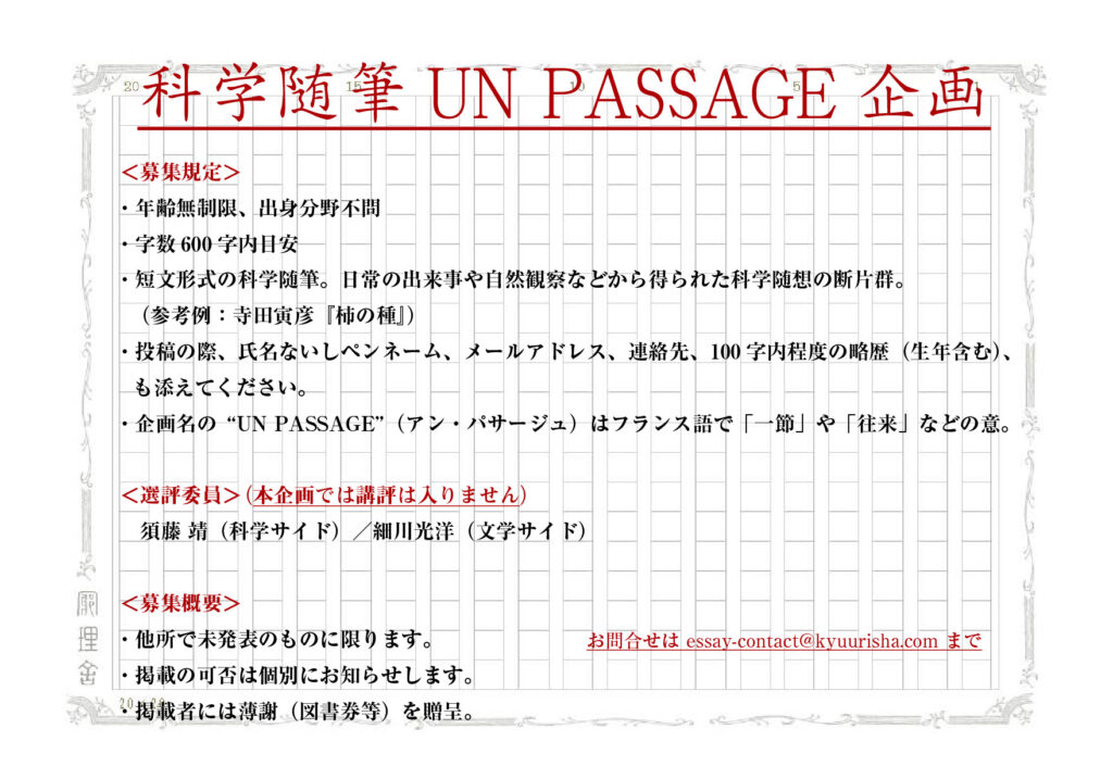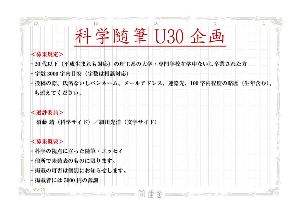 現在連載中の投稿企画「科学随筆U30」の科学サイドでの講評に、宇宙物理学者の須藤靖先生に入っていただくことになりました。須藤先生には、姉妹企画の「科学随筆UN PASSAGE」の選評なども相談していく予定です。